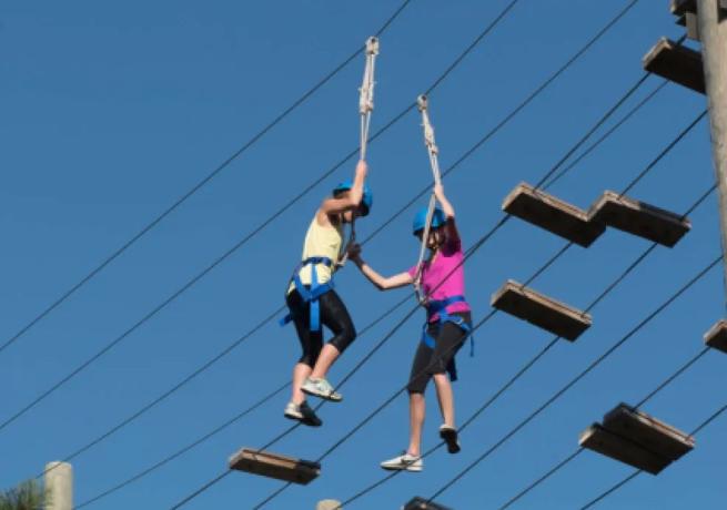 You’ll tackle a series of elevated obstacles including rope nets, swinging bridges and wobbly walkways set among the trees.